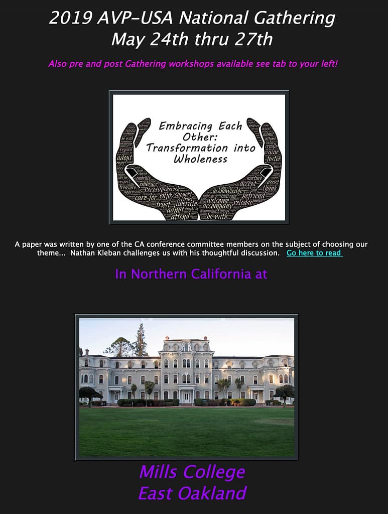 Ann Boone, Toby Laverty and Lawrence Soehnel led this workshop. Toby has been part of the success of Bay Bridge, the largest AVP council in California. He was hired experimentally as Outreach Coordinator in the northern Sierra mountains and is now volunteer Outreach Coordinator for Bay Bridge. Lawrence is AVP International’s Co-Clerk of Information.