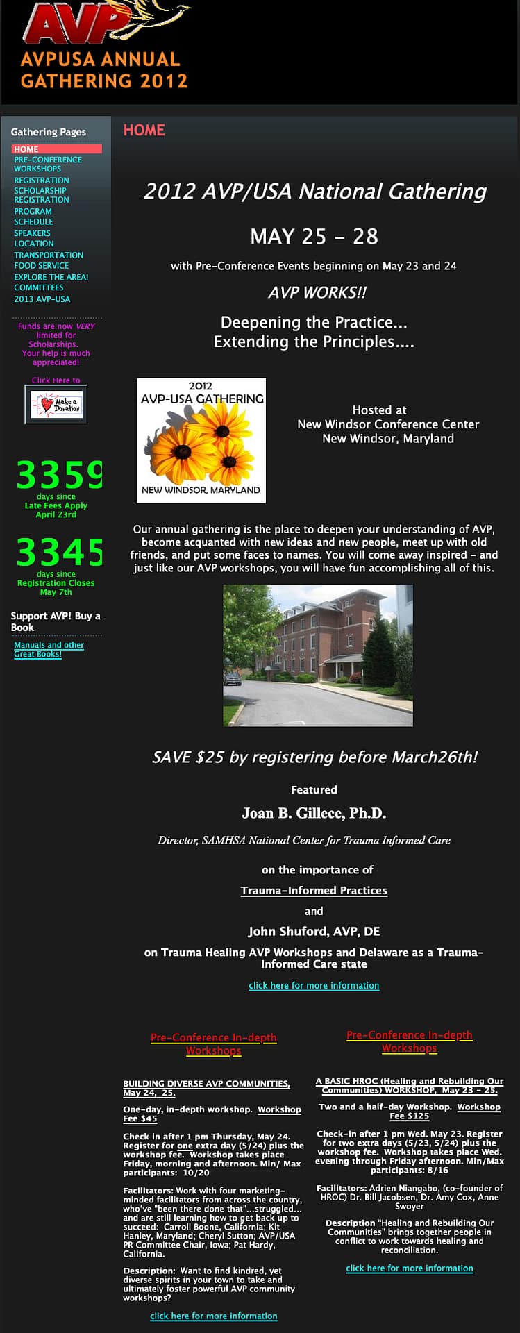Facilitator Rick Krouskop led participants through what it takes to easily create a Chapter website, from getting a domain name to editing and maintaining the site. Participants took a look at http://www.avpinternational.org/, http://www.avpusa.org/, and a developing site for AVP Massachusetts using the same technology and format as the International site. After comparing the sites for content potential and complexity of maintenance, several people started to build their own websites. Rick has been Webmaster for AVP/USA since its inception in 1998.