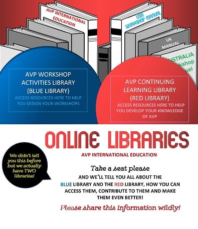 Once you’re logged in, on the Home page, click on Resources. On the right column you will see the heading Online Libraries, select AVP Workshop Activities Library or AVP Continuing Learning Library and you are there!